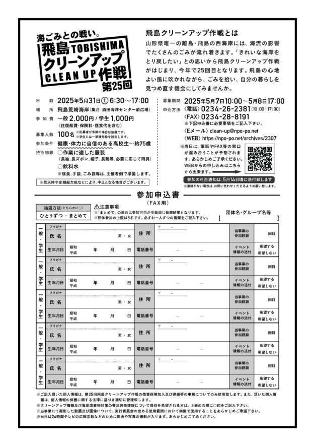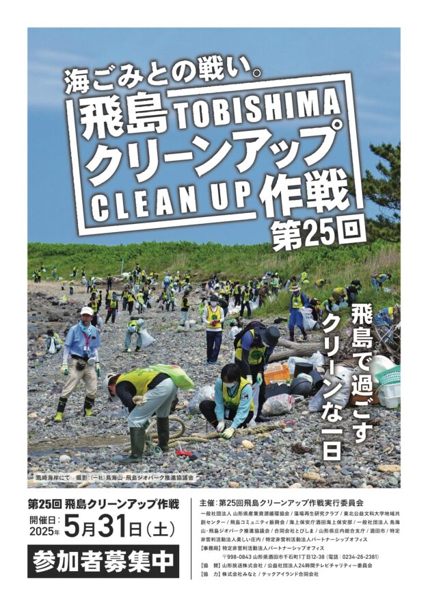 山形県唯一の離島・飛島の西海岸には、海流の影響 で た く さ ん の ごみが流れ着きます。「きれいな海岸をとり戻したい」との思いから飛島クリーンアップ作戦がはじまり、今年で25回目となります。飛島の心地よい風に吹かれながら、ごみを拾い、自分の暮らしを見 つめ直す機会にしてみませんか?