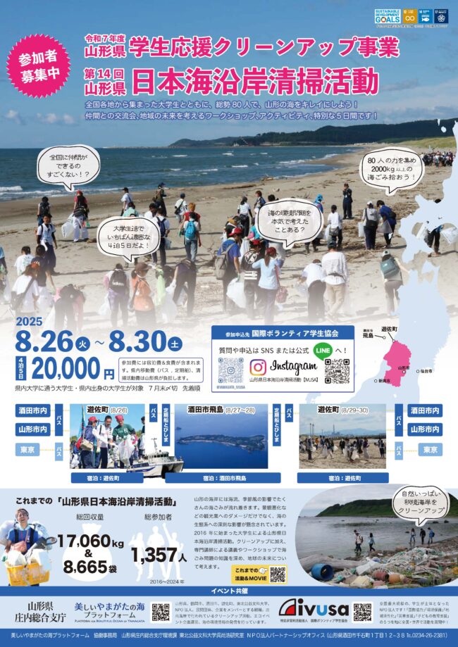 令和7年8月26日(火)〜8月30日(土)の5日間、山形県、NPO法人国際ボランティア学生協会と美しいやまがたの海プラッ...